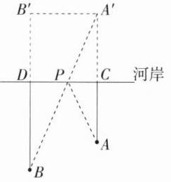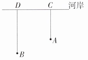 C 如图,作 $A$ 点关于河岸 $CD$ 的对称点 $A'$,连接 $BA'$ 交河岸 $CD$ 于 $P$,连接 $PA$,过 $A'$ 作 $A'B'\perp BD$ 交 $BD$ 的延长线于 $B'$,则 $PB + PA = PB + PA' = BA'$,将牛牵到河边的 $P$ 处饮水,此时牧童所走的路程最短.