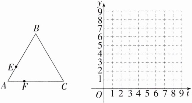 16.(2023重庆中考A卷,23,★★☆)如图,$\triangle ABC$是边长为4的等边三角形,动点$E,F$分别以每秒1个单位长度的速度同时从点$A$出发,点$E$沿折线$A→B→C$方向运动,点$F$沿折线$A→C→B$方向运动,当两者相遇时停止运动.设运动时间为$t$秒,点$E,F$的距离为$y$.(M8204003)