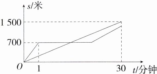 **解析**:由图象可知,图中折线是兔子所跑的路程与时间的图象,图中直线是乌龟所爬的路程与时间的图象。兔子在起初每分钟跑$700\div1 = 700$(米),乌龟每分钟爬$1500\div30 = 50$(米),$\because700\div50 = 14$(分钟),