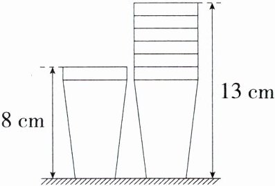 设叠放在一起的纸杯的总高度$y(\text{cm})$与纸杯数量$x$(个)之间的函数关系式为$y = kx + b(k\neq0)$,将$(1,8)$,$(6,13)$代入$y = kx + b$得$\begin{cases}k + b = 8\\6k + b = 13\end{cases}$,解得$\begin{cases}k = 1\\b = 7\end{cases}$。
