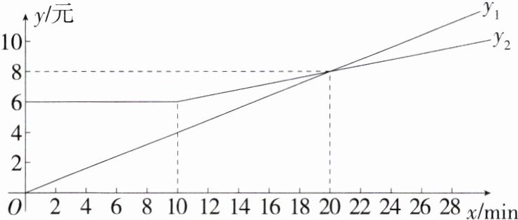 $\therefore y_2=\frac{1}{5}x + 4$,$\therefore y_2=\begin{cases}6(0<x\leqslant10)\\\frac{1}{5}x + 4(x>10)\end{cases}$,