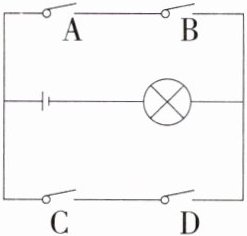 15.应用意识 (2024湖北模拟)如图,电路图上有4个开关A、B、C、D和1个小灯泡,在所有的元件和线路都正常的前提下,下列操作中,使“小灯泡发光”这个事件是不可能事件的是 (M9204001) ( )