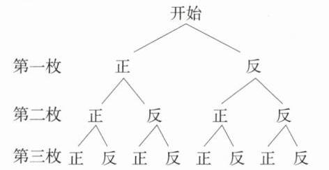 共有8种等可能的结果,其中恰有两枚硬币反面向上的结果有(正,反,反),(反,正,反),(反,反,正),共3种,