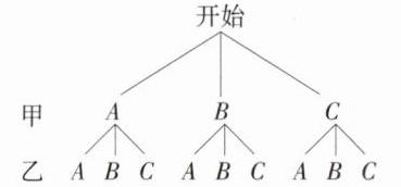 解析 把第一个专柜的臭豆腐、剁椒酱和永丰辣酱分别记为1、2、3,第二个专柜的酱板鸭和湘西腊肉分别记为A、B,第三个专柜的古丈毛尖和君山银针分别记为甲、乙,画树状图如下:
