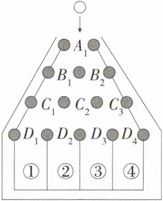 13. 数据观念(2021江苏徐州中考)如图所示的是一个竖直放置的钉板,其中,黑色圆面表示钉板上的钉子,A1、B1、B2、…、D3、D4分别表示相邻两颗钉子之间的空隙,这些空隙大小均相等,从入口A1处投放一个直径略小于两颗钉子之间空隙的圆球,圆球下落过程中,总是碰到空隙正下方的钉子,且沿该钉子左右两个相邻空隙继续下落的机会相等,直至圆球落入下面的某个槽内.用画树状图的方法,求圆球落入③号槽内的概率.