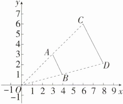 解析:$\because$以原点$O$为位似中心,在第一象限内将线段$AB$放大为原来的 2 倍后得到线段$CD$,$A$点的对应点是$C$点,$A(3,3)$,$\therefore C(6,6)$。