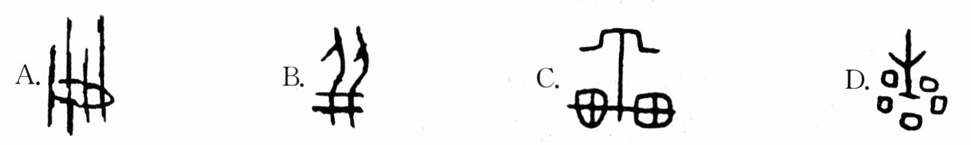 3. 龙一鸣想在演讲时利用PowerPoint呈现书籍的演变历史,查资料发现,甲骨文的“册”字,像是用一根绳子把竹简编串起来。下列甲骨文中,是“册”字的一项是( )。(2分)