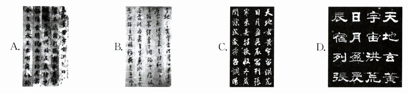 3.【书法真精彩】隶书古色古香,行书流畅,楷书端庄,草书奔放。下列是楷书的一项是( )。(2分)