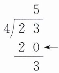 1. 23名师生去划船,每条船坐4人,能坐满几条船?还剩几人?右边的竖式中,“←”所指的数表示的意思是( )。