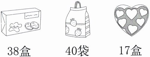 $38\div4 = 9(个)\cdots\cdots2(盒)$ $40\div5 = 8(个)$ $17\div2 = 8(个)\cdots\cdots1(盒)$ $9>8$ 最多可以做8个这样的大礼包。