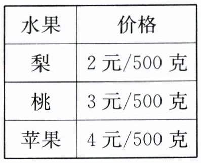 (3)梨、桃、苹果各买500克,一共要花多少钱?2 + 3 + 4 = 9(元)(答案不唯一)