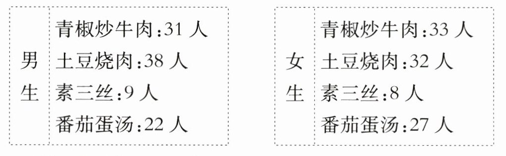 4.素三丝,因为调查的人数中,喜欢吃素三丝的人数最少。(答案不唯一)