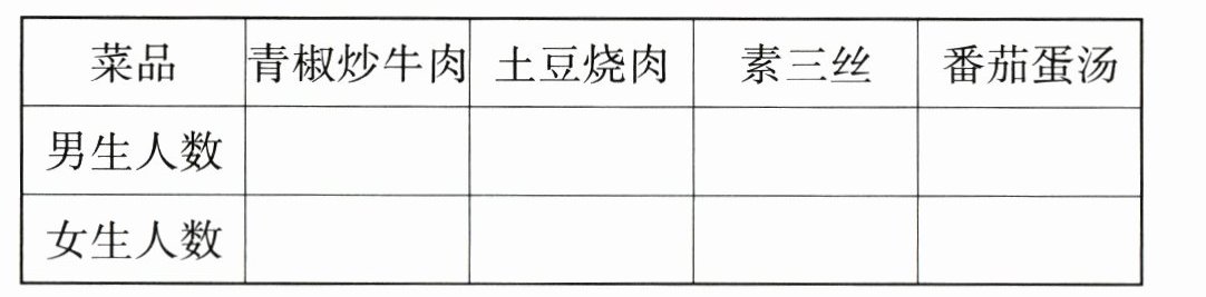 3. 最喜欢吃( )的男生最多;最喜欢吃土豆烧肉的女生人数是最喜欢吃素三丝的( )倍。(4分)