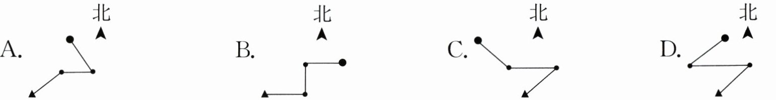 2. 奶奶从家出发到公园散步($\cdot$代表奶奶家,$\bullet$代表公园)。她先向东北方向走了一段路,然后向东走了一段路,最后向西北方向走到公园。奶奶行走的路线是( )。