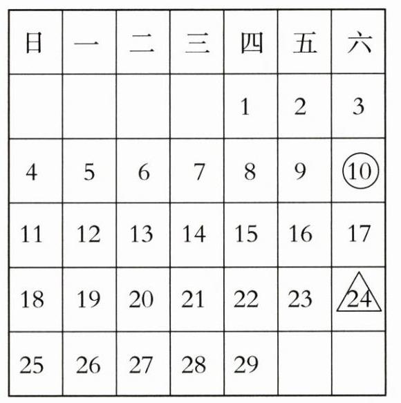 (2)2024年2月10日是农历正月初一,这一天是中国农历新年,即春节,请用“〇”在月历中圈出春节这一天;农历正月十五是元宵节,请用“△”在月历中圈出来。(2分)