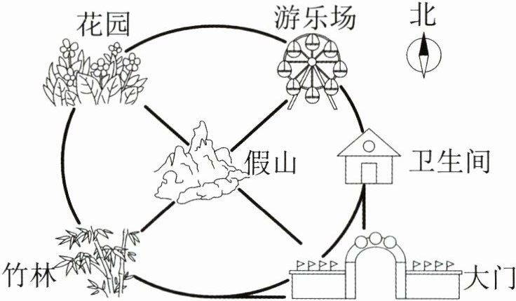 (2)游乐场在竹林的( )方向,卫生间在假山的( )面。(4分)