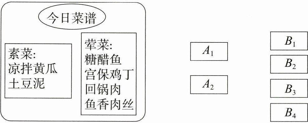 2. 安心快餐店的菜谱如下。选一种素菜和一种荤菜,有( )种不同的选法。先连一连再填空。(6分)