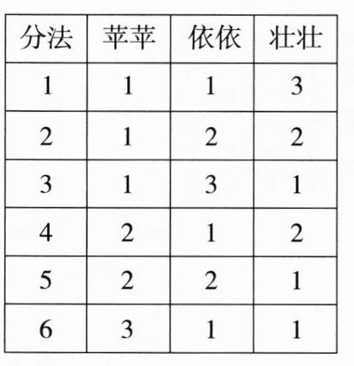 3. 端午节吃粽子是我国的传统习俗。把5个粽子分给苹苹、依依、壮壮,每个小朋友至少分1个粽子,有多少种分法? 用一个你喜欢的方式展现你的思考过程和结果。(6分)