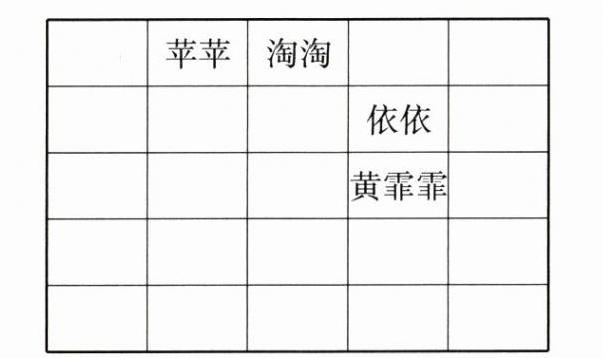1. 淘淘、依依、苹苹、黄霏霏四人玩“跳格子”的游戏。他们各跳到了什么位置?请照样子在方格内写上对应的名字。(9分)