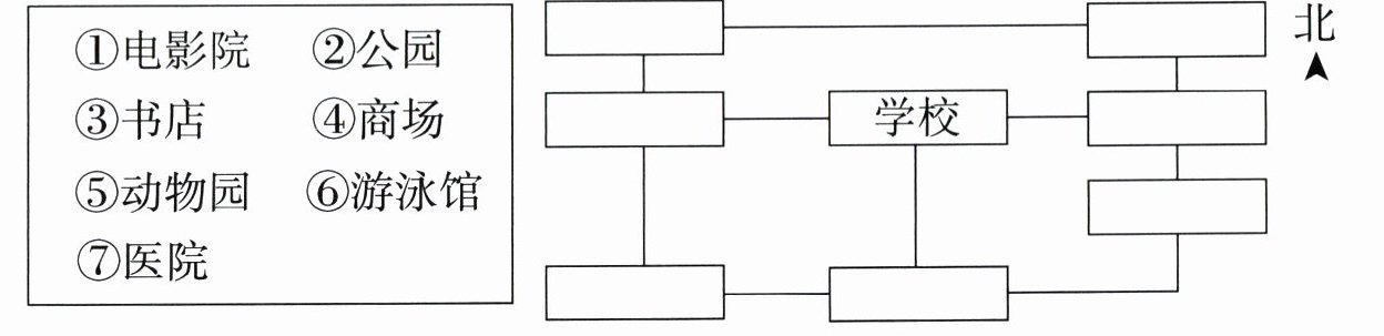 学校的东南方是电影院,公园在学校的西北方,书店在公园的东面,学校在商场的北面,动物园在学校的西南方,游泳馆在学校的西面,医院在学校的东面。