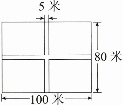 3.有一块长方形场地,长100米,宽80米,场地中间横竖各有一条宽5米的人行道,正好把场地平均分成4块草坪。场地上人行道的面积是多少平方米?草坪的面积是多少平方米?(12分)