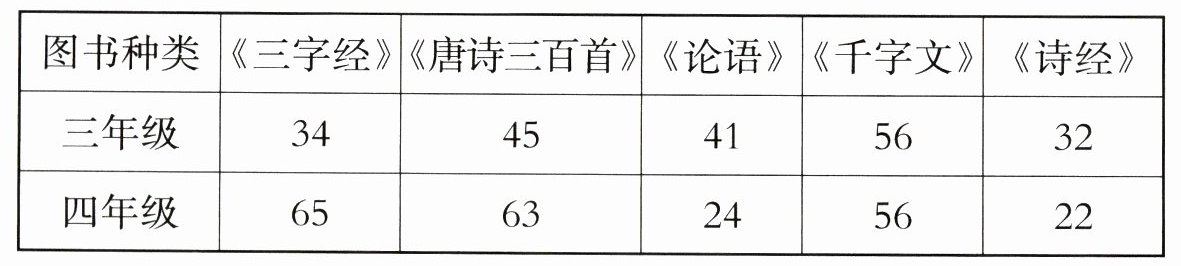 2. 2024年世界读书日的主题是“阅读改变未来”。4月23日这天,实验小学三、四年级组织了国学诵读活动,具体情况统计如下:(每人只读1本)(8分)
