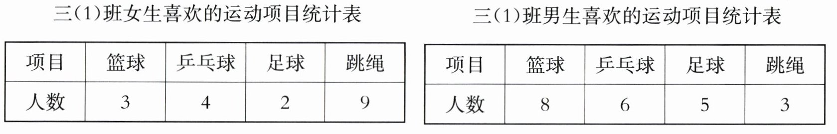 (2)女生喜欢( )运动项目的人最多,男生喜欢( )运动项目的人最多。