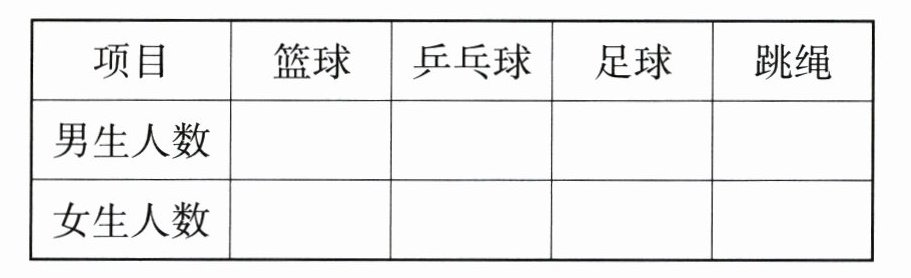 (3)喜欢打篮球的一共有( )人,喜欢打乒乓球的男生比女生多( )人。