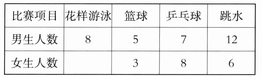 (1)最关注花样游泳的女生人数比男生人数的2倍少3人,最关注花样游泳的女生有( )人。