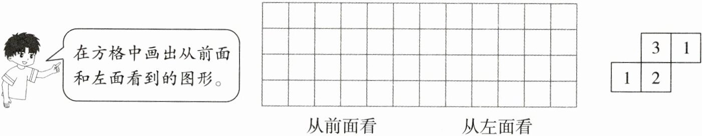 (每个正方形上面的数字表示在这个位置上所用的小正方体的个数)。观察这个几何体,从前面看到的图形是( ),从左面看到的图形是( )。