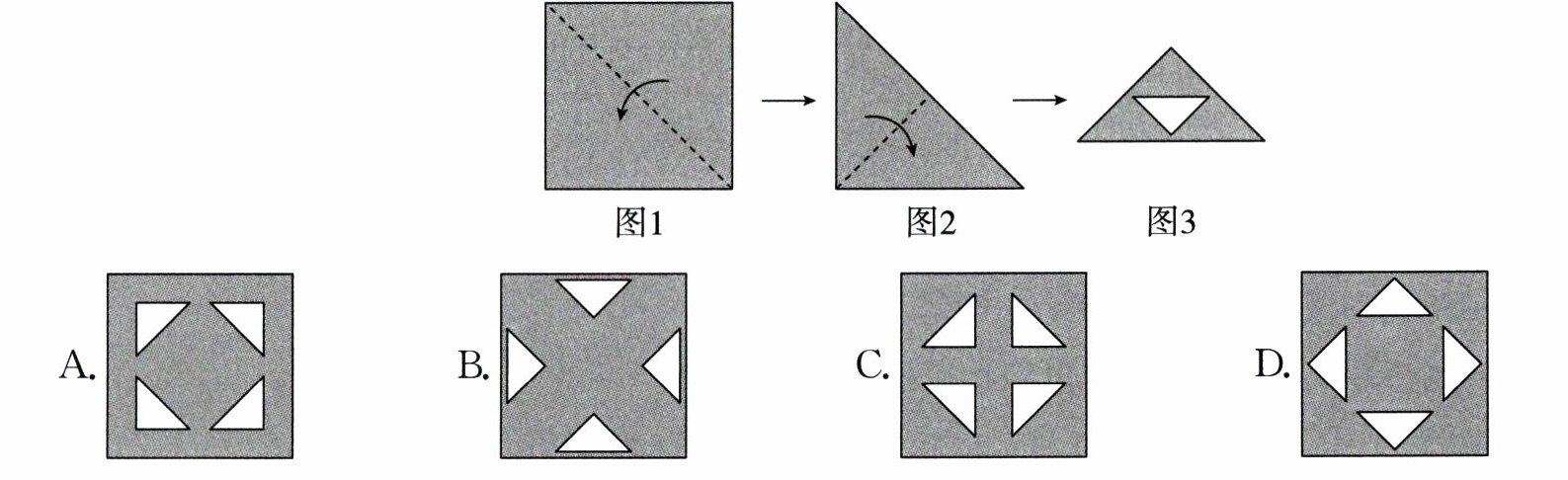 4. 把一张正方形纸按图1、图2的方式对折两次后,再按图3的方式剪去一个三角形,展开后得到的图形是( )。