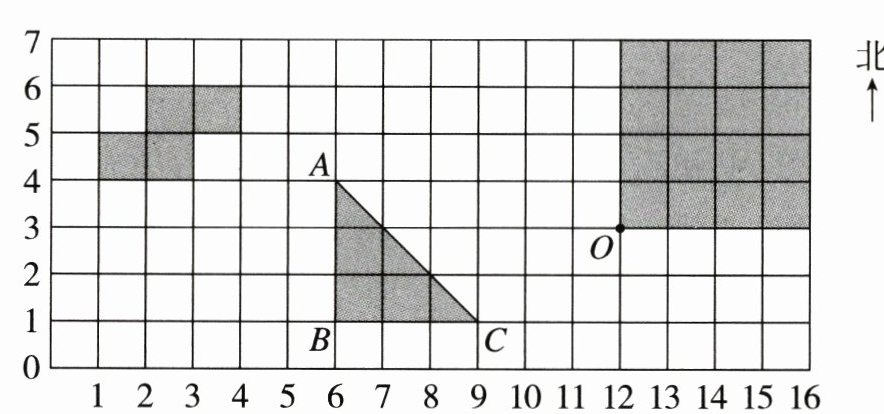 2. 在三角形ABC中,点B的位置用数对表示是( , ),点C在点A的( )偏( )( )°方向上。画出三角形ABC绕点A逆时针旋转90°后的图形。(4分)