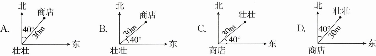 5. 商店在壮壮东偏北40°方向,距离30m处,下图符合描述的是( )。