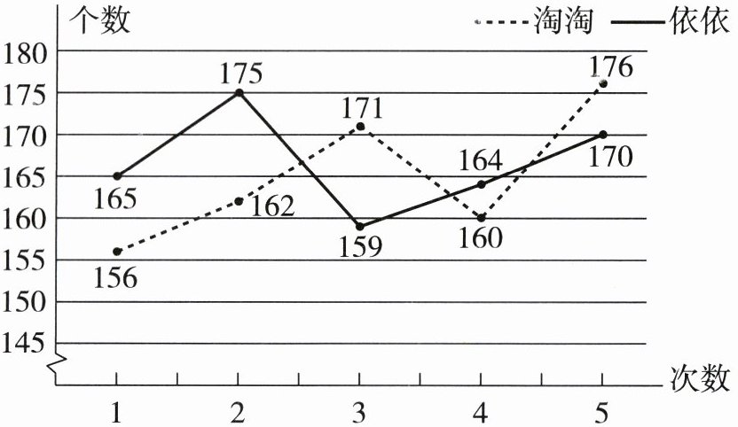 4. 体育课上淘淘和依依分别统计了自己5次跳绳的数量,并绘制成统计图如右图。