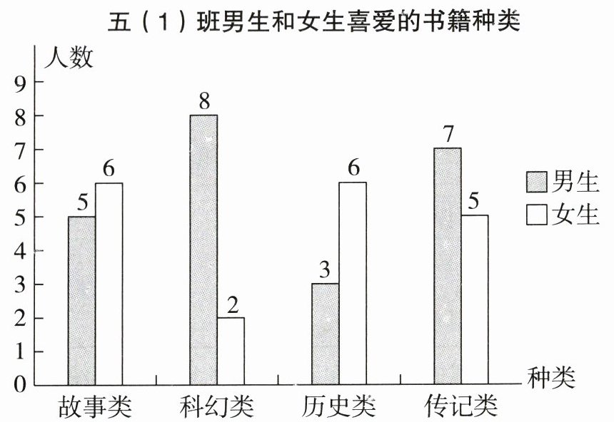 9. 五(1)班的孩子们统计了男生和女生各自喜爱的书籍种类并绘制成了统计图(右图),下列说法正确的是( )。