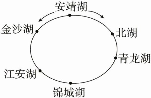 21. 成都天府绿道全程约104km,是成都新贯通的环城生态公园一级绿道。龙一鸣一家决定挑战天府绿道骑行。龙一鸣爸爸平均每时骑15km,妈妈平均每时骑11km,若爸爸从安靖湖出发,顺时针骑行,妈妈同时从反方向出发。估计两人在何处相遇?请在图中标出,多长时间后两人相遇?(7分)