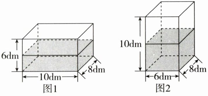 27. 有一个完全封闭的长方体容器,从里面量长10dm、宽8dm、高6dm。平时容器内水面高3dm(如图1)。如果把这个容器竖起来放(如图2),这时水的高度是多少分米?(8分)