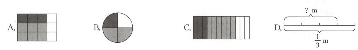 11.“数形结合”是很重要的数学思想,下面不能表示“$\frac{3}{4}$的$\frac{1}{3}$是多少”的图形是( )。