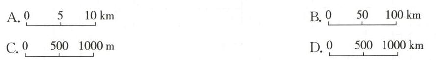 11. 一幅地图的比例尺是1:5000000,用线段比例尺表示正确的是( )。