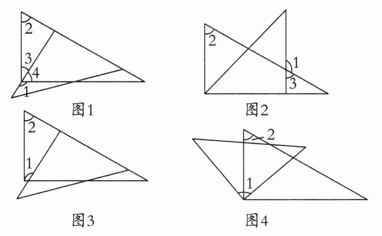解析 如图1,因为∠2 + ∠3 = 90°,∠3 + ∠4 = 90°,所以∠2 = ∠4. 因为∠1 + ∠4 = 180°,所以∠1 + ∠2 = 180°,所以∠1与∠2互补. 如图2,∠2 = ∠3,因为∠1 + ∠3 = 180°,所以∠1 + ∠2 = 180°,所以∠1与∠2互补. 如图3,因为∠2 = 60°,∠1 = 30° + 90° = 120°,所以∠1 + ∠2 = 180°,所以∠1与∠2互补. 如图4,因为∠1 = 90°,∠2 = 60°,所以∠1 + ∠2 = 90° + 60° = 150°,所以∠1与∠2不互补. 故选D.