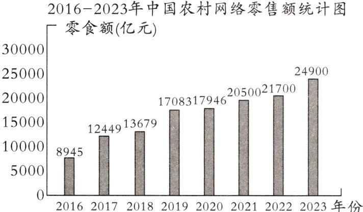 解析 根据统计图信息,得到8945<12449 <13679<17083<17946<20500<21700<24900,故2016年中国农村网络零售额最低,2023年中国农村网络零售额最高,A、B 正确,不符合题意;2016−2023年,中国农村网络零售额持续增加,C正确,不符合题意;从2021年开始,中国农村网络零售额突破20000亿元,故D错误,符合题意;故选D.
