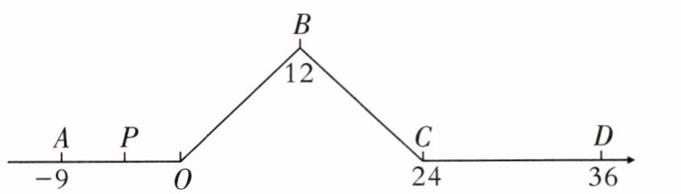 15. 七年级数学兴趣小组成员自主开展数学微项目研究,他们决定研究“折线数轴”. 如图,将一条数轴在原点$O$,点$B$,点$C$处折一下,得到一条“折线数轴”. 图中点$A$表示-9,点$B$表示12,点$C$表示24,点$D$表示36,动点$P$从点$A$出发,以2个单位长度/秒的初始速度沿着“折线数轴”向其正方向运动. 当运动到点$O$与点$B$之间时速度变为初始速度的一半;当运动到点$B$与点$C$之间时速度变为初始速度的2倍;经过点$C$后立刻恢复初始速度.