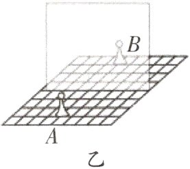 针对训练2小江为同学们表演魔术:如图甲所示,将一个正面开口的空箱面向同学,箱子的顶部中间有一个豁口。将一个棋子从顶部的豁口放入,从正面看去,棋子竟“不翼而飞”。小丹猜想箱中放置了一块平面镜,她找来薄玻璃板、方格纸、笔、刻度尺、两个完全相同的棋子A和B进行探究,如图乙所示。