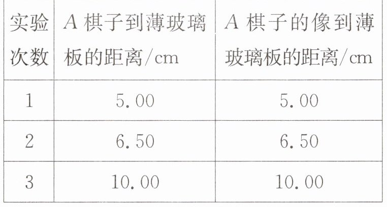 (4)改变棋子A的位置,重复步骤(2),发现棋子A的像与棋子A始终在方格纸的同一条直线上。用刻度尺分别测量它们到薄玻璃板的距离,记录在表格中。分析数据可知,棋子的像与棋子到薄玻璃板的距离________。
