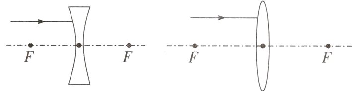 解析 平行与主光轴的光线经凹透镜折射后发散射出,其折射光线的反向延长线经过焦点;平行于主光轴的光线经凸透镜折射后经过焦点。