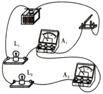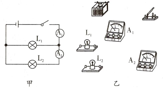 12. 在如图甲中,闭合开关后,通过灯泡L₁的电流为0.5 A,通过灯泡L₂的电流为0.4 A。试根据图甲将图乙中的实物用笔画线表示导线连接起来。