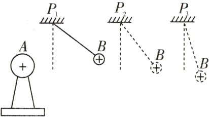 11. 小明参观了科技馆后,一组静电实验给他留下了深刻的印象,回来后他把实验情景绘成了一幅平面示意图,图中A为放在绝缘支架上的带正电球体,B为用绝缘丝线悬吊的带正电的小球。先后将小球B悬吊在距离A球远近不同的P₁、P₂、P₃处(如图所示)。