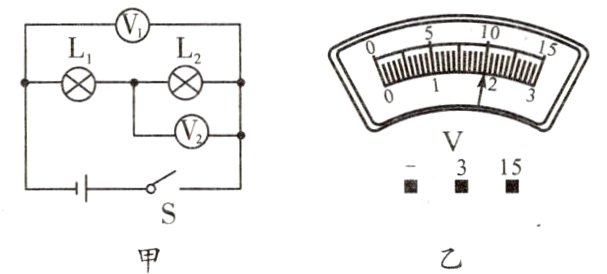 9. 小明按如图甲所示的电路进行实验,当闭合开关用电器正常工作时,电压表V₁和V₂的指针位置完全一样,如图乙所示,则L₂两端的电压为________ V,L₁两端的电压为________ V。