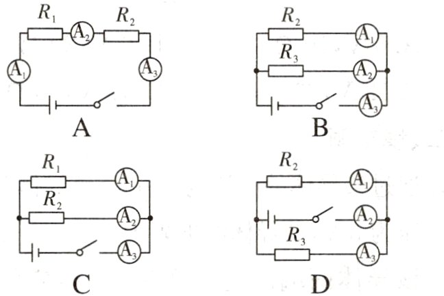3. 在探究电路的电流规律实验时用了如图中的某个电路,已知$R_1 = R_2 < R_3$,电流表的读数分别是:电流表$A_1$为0.3 A、电流表$A_2$为0.15 A、电流表$A_3$为0.45 A。则测量的电路图应是 ( )