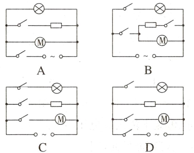 8. 有一种“浴霸”,具有照明、吹风和加热三个功能,其中照明灯和吹风机(用M表示)均可以单独控制,电热丝(用 表示)只有在吹风机启动后才可以工作。如图所示电路图中,符合上述要求的是 ( )